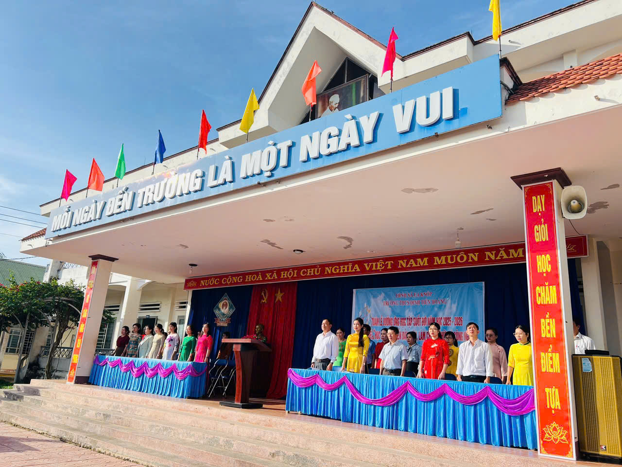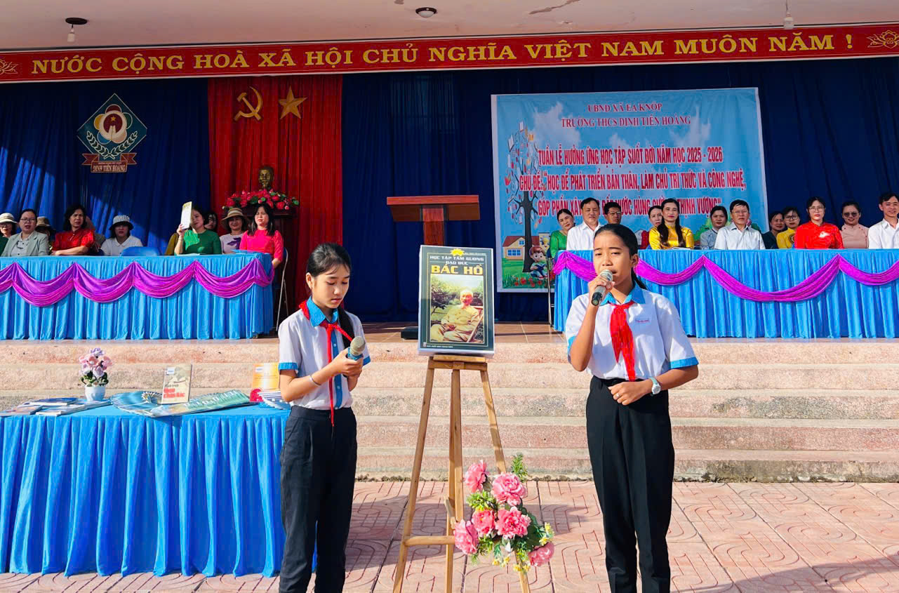 Thực hiện Kế hoạch số 43/KH-UBND ngày 24/9/2025 của UBND xã Ea Knốp, trường THCS Đinh Tiên Hoàng đã long trọng tổ chức buổi phát động Tuần lễ hưởng ứng học tập suốt đời năm 2025 với chủ đề “Học để phát triển bản thân, làm chủ tri thức và công nghệ, góp phần xây dựng đất nước hùng cường, thịnh vượng”. Chủ đề này nhấn mạnh tầm quan trọng của tự học, học tập suốt đời gắn với việc chủ động làm chủ tri thức và công nghệ.